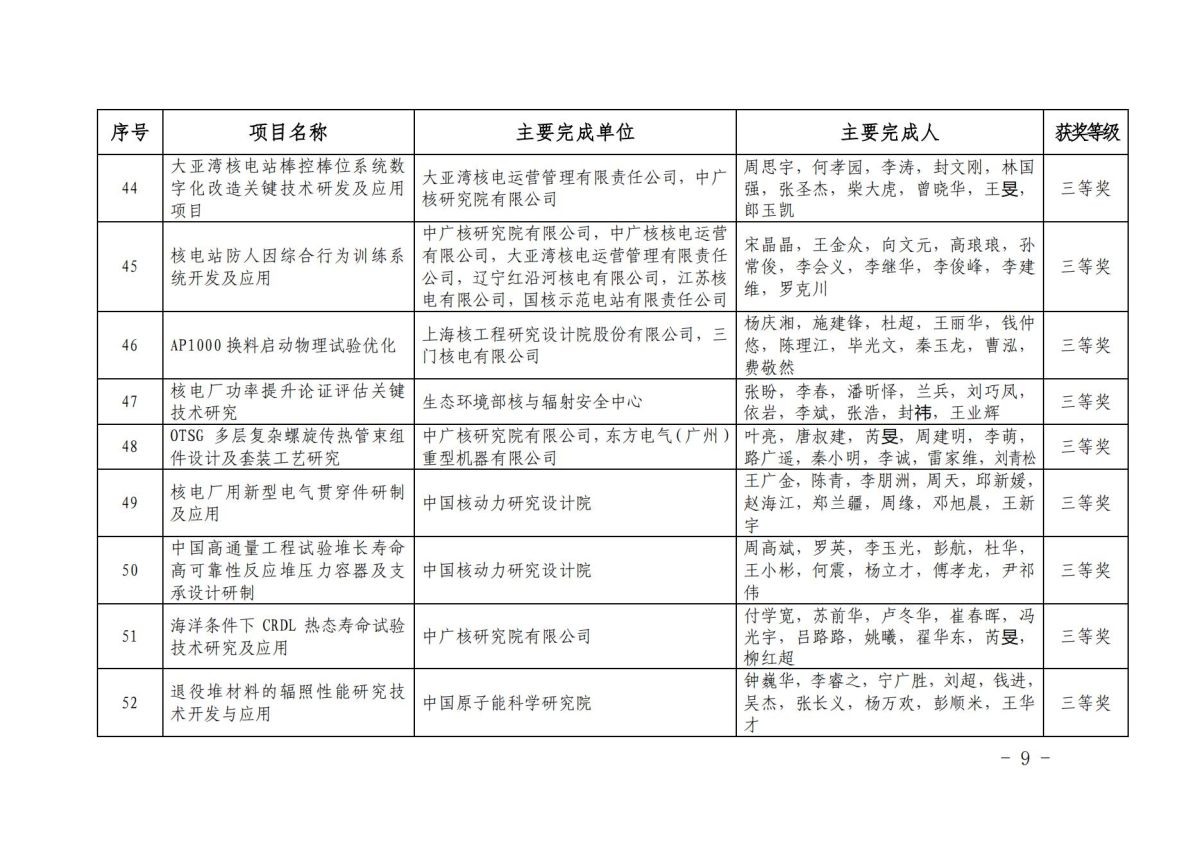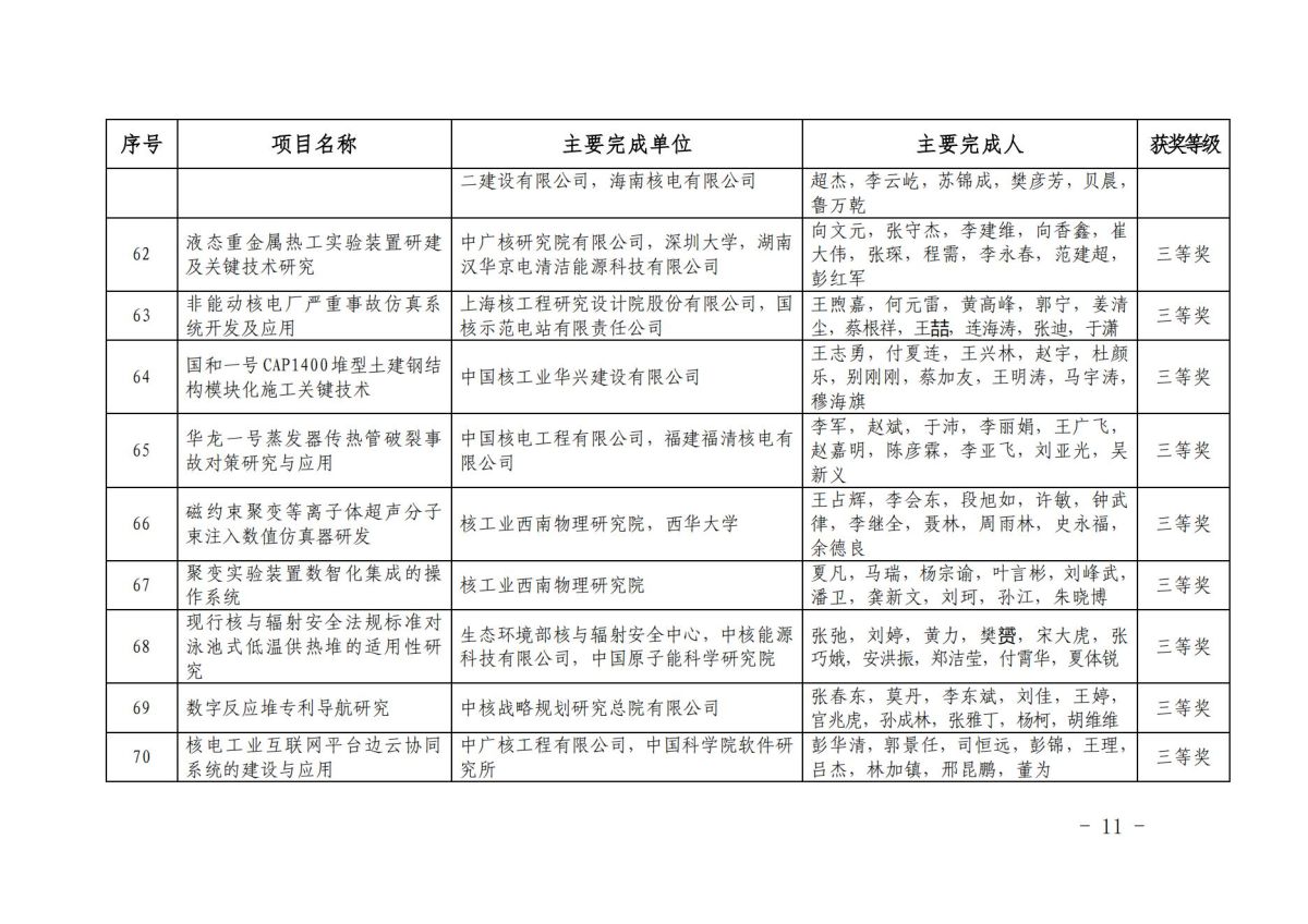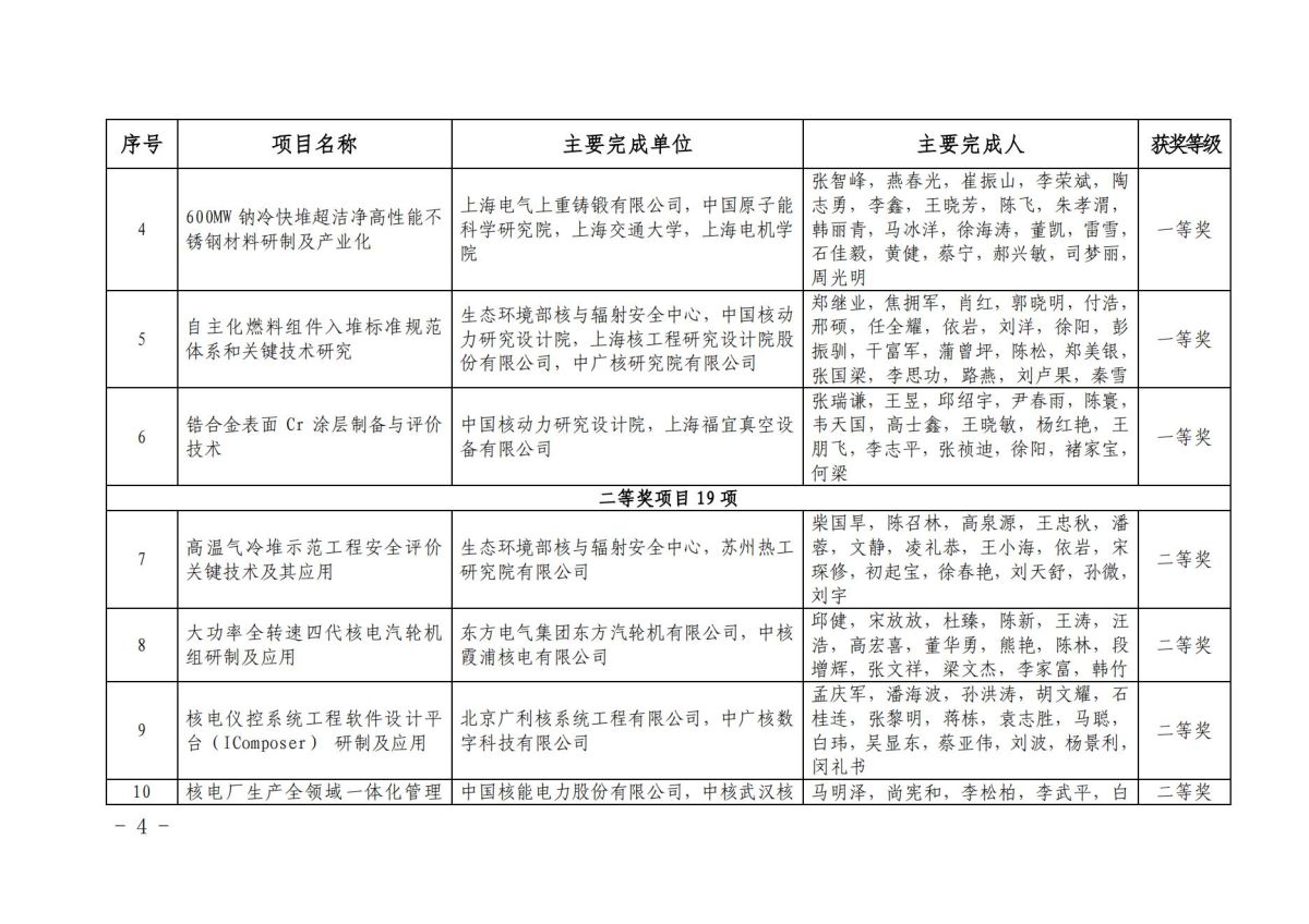 授予“核電廠水壓試驗(yàn)與在役檢查優(yōu)化研究及工程應(yīng)用”等6項(xiàng)成果科技進(jìn)步一等獎(jiǎng);授予“高溫氣冷堆示范工程安全評(píng)價(jià)關(guān)鍵技術(shù)及其應(yīng)用”等19項(xiàng)成果科技進(jìn)步二等獎(jiǎng);授予“石墨坩堝涂層激光微納燒結(jié)強(qiáng)化技術(shù)與裝備”等47項(xiàng)成果科技進(jìn)步三等獎(jiǎng)。