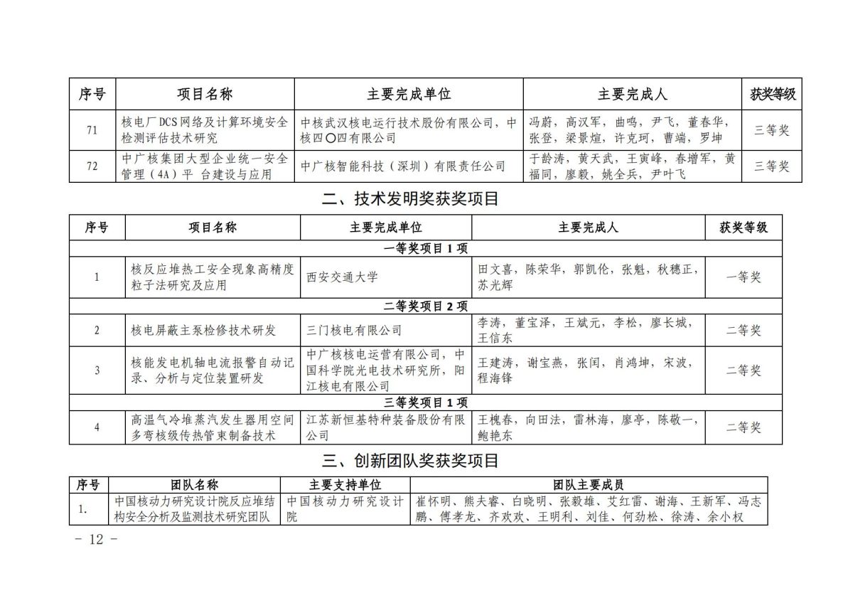 根據(jù)有關(guān)規(guī)定,中國(guó)核能行業(yè)協(xié)會(huì)組織科學(xué)技術(shù)獎(jiǎng)評(píng)審委員會(huì)及相關(guān)專家,對(duì)申報(bào)2024年度中國(guó)核能行業(yè)協(xié)會(huì)科學(xué)技術(shù)獎(jiǎng)(包括科技進(jìn)步獎(jiǎng)、技術(shù)發(fā)明獎(jiǎng)、創(chuàng)新團(tuán)隊(duì)獎(jiǎng)和青年創(chuàng)新人物獎(jiǎng))的265項(xiàng)申報(bào)和推薦材料,進(jìn)行了形式審查、網(wǎng)絡(luò)評(píng)審、專業(yè)評(píng)審組初評(píng)、評(píng)審委員會(huì)終評(píng)、公示,經(jīng)核準(zhǔn),決定對(duì)其中76項(xiàng)優(yōu)秀科技成果、5個(gè)創(chuàng)新團(tuán)隊(duì)和8名青年創(chuàng)新人物予以獎(jiǎng)勵(lì)。