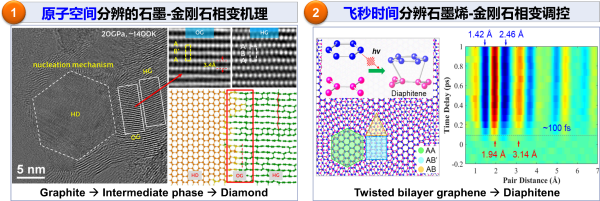 聯(lián)合團隊圍繞石墨向金剛石轉(zhuǎn)化之謎開展聯(lián)合關(guān)鍵技術(shù)攻關(guān),在原子空間與飛秒時間尺度下,完整捕捉到石墨向金剛石轉(zhuǎn)變的關(guān)鍵中間態(tài)和演化路徑以及多種新型亞穩(wěn)態(tài)結(jié)構(gòu),為高純度六方金剛石的合成奠定了原子尺度表征技術(shù)實現(xiàn)手段。一是借助高分辨透射電鏡和電子衍射技術(shù),首次在原子尺度上直接觀察到理論預測的正交石墨(AB′堆垛)中間相,并完整捕捉到六角石墨(AB堆垛)→正交石墨→六方/立方金剛石的原子級演化路徑,為“成核-生長”機制提供了直接實驗證據(jù)。這些發(fā)現(xiàn)解決了近70年來關(guān)于石墨-金剛石相變微觀路徑的核心問題。二是利用原子分辨的超快電子衍射技術(shù),對轉(zhuǎn)角雙層石墨烯進行飛秒激光泵浦-超快電子探測實驗,首次發(fā)現(xiàn)具有特定AA/AB'堆垛的轉(zhuǎn)角石墨烯在約100 fs的超快時間尺度上形成瞬態(tài)二維金剛石結(jié)構(gòu)“Diaphitene”,而純AB堆垛則未觀察到此現(xiàn)象。這一發(fā)現(xiàn)展示了超快光場調(diào)控相變的獨特潛能,為合成新型二維金剛石材料提供了全新路徑。