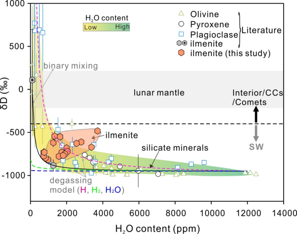 月壤中鈦鐵礦和硅酸鹽相的水含量與δD分布圖