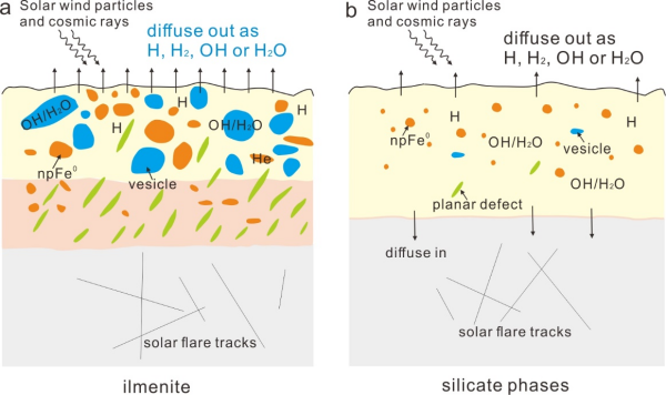 研究團(tuán)隊(duì)進(jìn)一步提出,鈦鐵礦和硅酸鹽礦物在水含量和H同位素組成上的差異很可能與其晶體結(jié)構(gòu)有關(guān)。鈦鐵礦中的Fe-O和Ti-O鍵能低于硅酸鹽礦物中的Si-O鍵,使其更容易與太陽(yáng)風(fēng)注入的H發(fā)生反應(yīng)形成OH/H2O,同時(shí)促進(jìn)納米金屬鐵的形成。月壤顆粒風(fēng)化層中廣泛發(fā)育的囊泡結(jié)構(gòu)是太陽(yáng)風(fēng)輻照作用的另一重要微觀結(jié)構(gòu)特征。太陽(yáng)風(fēng)注入的H和He會(huì)在囊泡中富集,當(dāng)囊泡內(nèi)部氣壓超過(guò)某一臨界閾值時(shí),反而會(huì)加速捕獲H的逃逸。此外,月表頻繁的溫度變化、微隕石撞擊以及太陽(yáng)風(fēng)濺射等過(guò)程,也會(huì)進(jìn)一步促進(jìn)鈦鐵礦中生成的水的丟失,導(dǎo)致其難以穩(wěn)定保存。