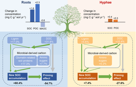 該研究系統(tǒng)闡明了根系與菌絲在熱帶森林土壤碳匯中的相對作用,凸顯了根系性狀在碳固存中的核心地位。研究結果表明,在熱帶森林恢復與管理中,應優(yōu)先選用具備高效碳輸入能力的樹種,并結合菌根共生策略,以提升土壤碳匯功能。