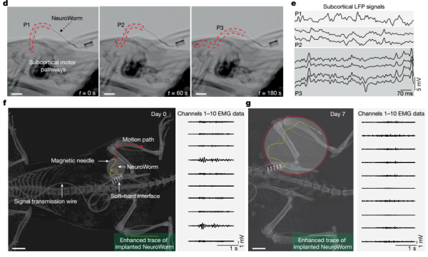 研究團(tuán)隊(duì)將這種動(dòng)態(tài)電極命名為NeuroWorm。在磁場控制下,NeuroWorm實(shí)現(xiàn)了在實(shí)驗(yàn)對象兔子顱內(nèi)“游走”,并根據(jù)需要主動(dòng)更換監(jiān)測目標(biāo)。