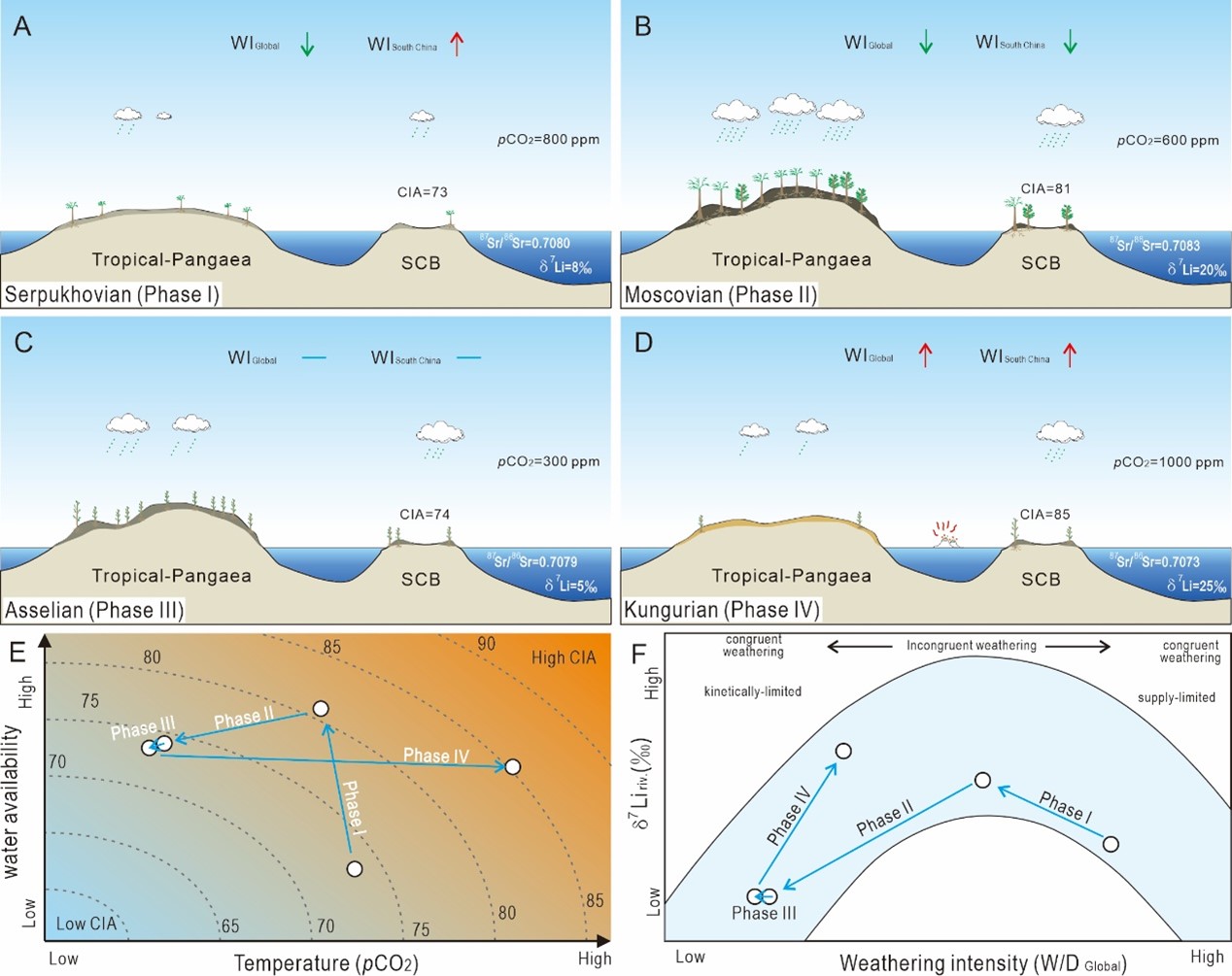 研究發(fā)現(xiàn),貴州納慶剖面的CIA記錄顯示清晰的區(qū)域風(fēng)化強(qiáng)度的四個(gè)階段演化過(guò)程。其中,在晚石炭世–早二疊世時(shí),其與大氣CO2濃度變化基本耦合,表明了華南區(qū)域大陸風(fēng)化強(qiáng)度主要受溫室氣體(氣候)的控制。然而,在早石炭世晚期–晚石炭世早期,在大氣CO2濃度下降、大陸冰川體積擴(kuò)張及氣候變冷背景下,華南大陸風(fēng)化強(qiáng)度呈現(xiàn)增強(qiáng)趨勢(shì),這表明另有其他強(qiáng)迫因素??蒲腥藛T基于相關(guān)數(shù)據(jù)分析,排除了物源、沉積物粒度及成巖作用等區(qū)域因素影響,并綜合對(duì)比了同時(shí)期的地質(zhì)記錄,表明古熱帶雨林?jǐn)U張是其最合理的驅(qū)動(dòng)來(lái)源。