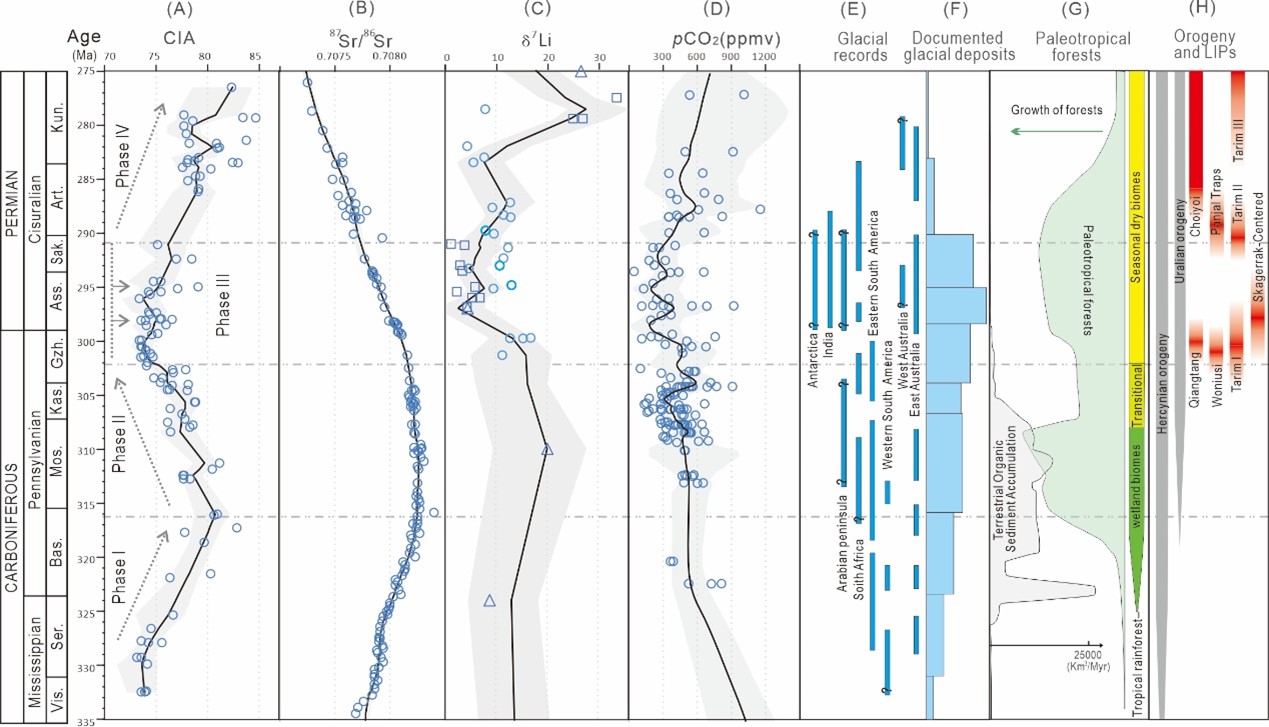 晚古生代大冰期啟動(dòng)于泥盆紀(jì)-石炭紀(jì)之交,于二疊紀(jì)早期主幕結(jié)束,是地球自陸地出現(xiàn)維管類(lèi)高等植物和復(fù)雜生態(tài)系統(tǒng)以來(lái),唯一記錄全球從“冰室”向“溫室”氣候轉(zhuǎn)變的地質(zhì)時(shí)期。大量研究表明,泛大陸低緯度地區(qū)的海西造山運(yùn)動(dòng)和陸地植物演化與擴(kuò)張,均可通過(guò)提高大陸硅酸鹽風(fēng)化速率,使大氣CO2濃度降低,從而驅(qū)動(dòng)和調(diào)節(jié)晚古生代大冰期演化。闡明上述兩大驅(qū)動(dòng)因素如何影響大陸硅酸鹽風(fēng)化作用,有助于學(xué)界理解晚古生代大冰期的古氣候動(dòng)力學(xué)。