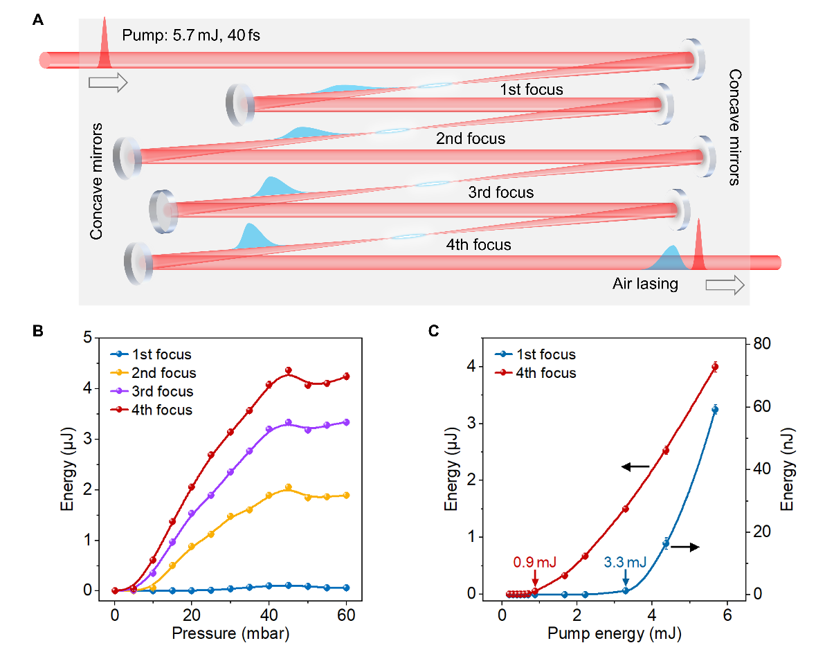 (A)空氣激光的級(jí)聯(lián)放大方案示意圖;(B)不同聚焦次數(shù)下獲得的空氣激光能量隨氣壓的變化;(C)單次和四次聚焦情況下,在40 mbar氮?dú)庵蝎@得的空氣激光能量隨泵浦能量的變化