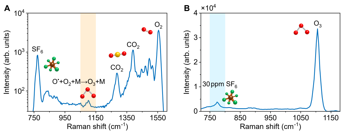 研究團(tuán)隊(duì)基于四次聚焦產(chǎn)生的泵浦光和空氣激光,進(jìn)一步發(fā)展了高靈敏的單光束相干拉曼光譜技術(shù),實(shí)現(xiàn)了SF6、CO2、O2以及光絲中產(chǎn)生的O3等多種分子同時(shí)探測(cè),且SF6氣體最小探測(cè)濃度達(dá)到30ppm水平。