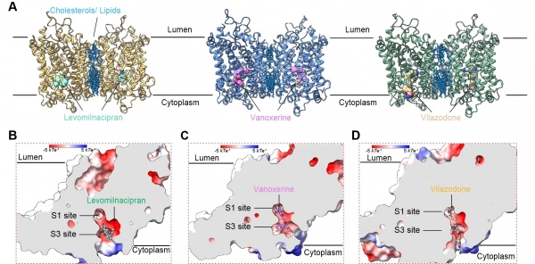 研究團(tuán)隊分別解析了人源NET與抗抑郁藥物左米那普侖、維拉佐酮,以及NET與多巴胺轉(zhuǎn)運(yùn)體雙重再攝取抑制劑伐諾司林結(jié)合的三個冷凍電鏡結(jié)構(gòu),分辨率達(dá)2.44?至2.52 ?。研究顯示,三種復(fù)合物中,NET均呈現(xiàn)內(nèi)向開放構(gòu)象。其中,左米那普侖結(jié)合于NET內(nèi)向開放構(gòu)象特異的新型變構(gòu)位點。該位點被命名為S3,以區(qū)別于中央正構(gòu)位點S1和位于靠近胞外區(qū)的外向開放構(gòu)象變構(gòu)位點S2。與之不同,維拉佐酮和伐諾司林同時占據(jù)S1與S3位點。