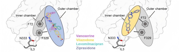 團(tuán)隊通過對三個復(fù)合物結(jié)構(gòu)精細(xì)分析,并與已報道的齊拉西酮–NET復(fù)合物進(jìn)行結(jié)構(gòu)比較,結(jié)合分子對接結(jié)果,提出了NET抑制劑識別的“瓣膜模型”,即NET內(nèi)向開放空腔中的兩個關(guān)鍵苯丙氨酸殘基F72和F329如同“心臟瓣膜”,其側(cè)鏈相對排列,且側(cè)鏈構(gòu)象隨不同抑制劑的結(jié)合而發(fā)生改變。這兩個殘基將內(nèi)向開放空腔分隔為內(nèi)室與外室兩個非對稱區(qū)域。不同化學(xué)結(jié)構(gòu)的抑制劑被“瓣膜”引導(dǎo)結(jié)合至不同區(qū)域,如左米那普侖、維拉佐酮及伐諾司林結(jié)合于外室,齊拉西酮結(jié)合于內(nèi)室。該模型揭示了NET如何特異性識別結(jié)構(gòu)多樣的抑制劑,為理性藥物設(shè)計提供了新的理論框架。
