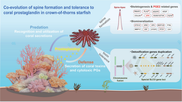 該研究聚焦珊瑚敵害物種防控問題,以南海珊瑚礁區(qū)域的長棘海星為對象,探究其適應與演化規(guī)律。研究揭示了長棘海星基因組結(jié)構(gòu)演化特征,發(fā)現(xiàn)其基因座復制導致負責前列腺素轉(zhuǎn)運的蛋白基因(SLCO家族)明顯擴增。分析表明,SLCO基因擴張時間與珊瑚繁茂時期相對應,這從側(cè)面揭示了長棘海星對珊瑚分泌物中毒性前列腺素E2(PGE2)的適應性進化策略。結(jié)合棘皮動物普遍缺乏內(nèi)源PGE2合成途徑的特征,研究推斷,長棘海星或通過感知并利用珊瑚來源的外源PGE2信號,激活骨骼形成相關(guān)基因調(diào)控通路,從而促進棘刺與體型生長。