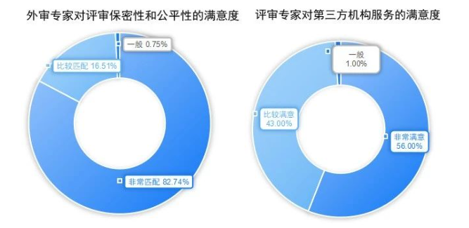 《報告》指出,外審專家對外部評審制度總體滿意度非常高。數(shù)據顯示,在外審專家對于評審過程的保密性和公平性滿意度方面,“非常滿意”占比82.74%,“比較滿意”占比16.51%,兩項總和達99%以上;外審專家對于第三方機構提供服務的“非常滿意”占比達到56% ,“比較滿意”占比43%,兩者之和達99%;在對于評審費的支付進度和額度的滿意程度上,雖然不同背景的專家有所差異,但總體滿意度較高,整體趨勢一致,顯示出評審制度在經濟激勵方面的有效性。從調研數(shù)據看,外審專家們對外部評審制度的總體評價中,“非常滿意”與“比較滿意”占比總和達到了99.06%。這反映了外部評審制度在流程設計、公正性、透明度等方面得到了專家的廣泛認可。