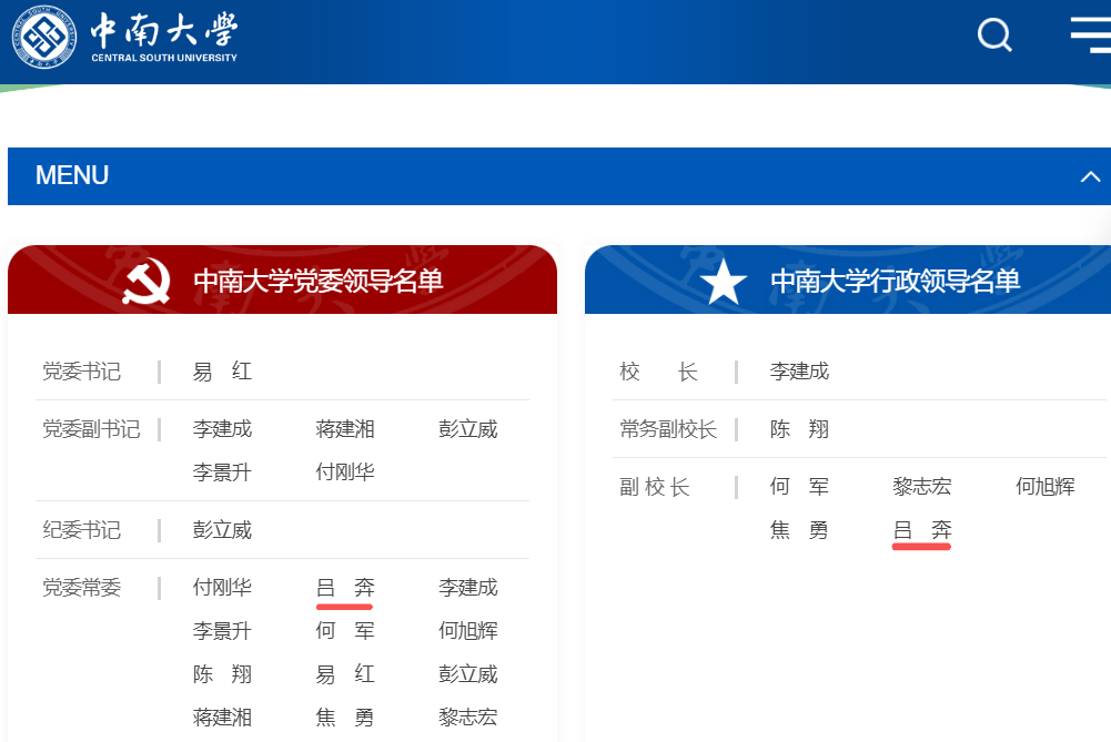 近日,中南大學(xué)官網(wǎng)“現(xiàn)任領(lǐng)導(dǎo)”一欄更新后顯示,呂奔已任中南大學(xué)黨委常委、副校長。