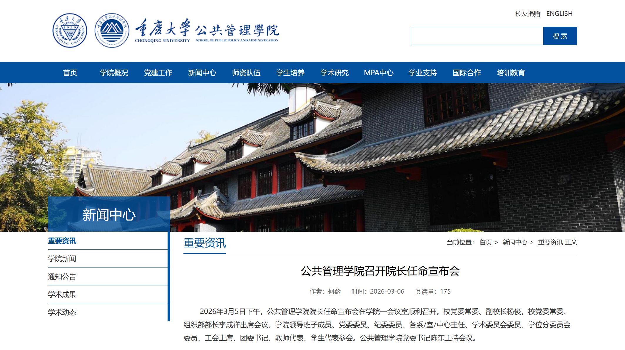 2026年3月5日下午,重慶大學(xué)公共管理學(xué)院院長(zhǎng)任命宣布會(huì)在學(xué)院召開。校黨委常委、副校長(zhǎng)楊俊,校黨委常委、組織部部長(zhǎng)李成祥出席會(huì)議,公共管理學(xué)院黨委書記陳東主持會(huì)議。會(huì)上,李成祥宣讀了學(xué)校黨委任免文件,任命汪濤同志為公共管理學(xué)院院長(zhǎng)。