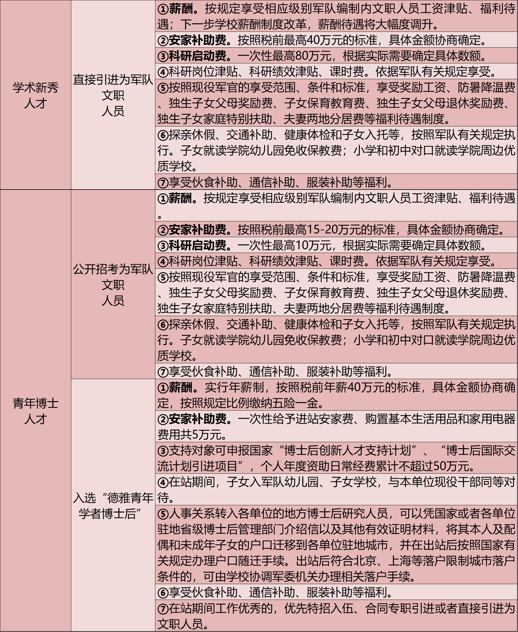 (四)公開招考為軍隊文職人員。符合青年博士人才條件的,可以公開招考為軍隊文職人員(免筆試),首聘合同期限為五年。①薪酬。按規(guī)定享受相應(yīng)級別軍隊編制內(nèi)文職人員工資津貼、福利待遇?,F(xiàn)行標(biāo)準(zhǔn)是應(yīng)屆博士生試用期滿后應(yīng)發(fā)工資約為12500元/月,并按照規(guī)定比例繳納五險一金。②安家補(bǔ)助費。按照稅前最高15萬元的標(biāo)準(zhǔn)發(fā)放。③科研啟動經(jīng)費。按照每名青年博士人才最高10萬元的標(biāo)準(zhǔn),根據(jù)實際需要確定具體數(shù)額。④科研崗位津貼、科研績效津貼、課時費、其他福利待遇以及子女教育等同直接引進(jìn)的軍隊文職人員。