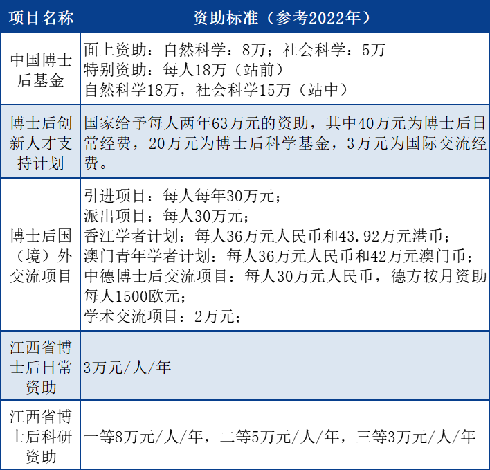 在站期間,博士后可依托我?;蚵?lián)合培養(yǎng)流動(dòng)站所在單位申請以下國家等級(jí)和省級(jí)博士后項(xiàng)目,具體項(xiàng)目名稱和獲批后資助金額(參考2022年)見下表: