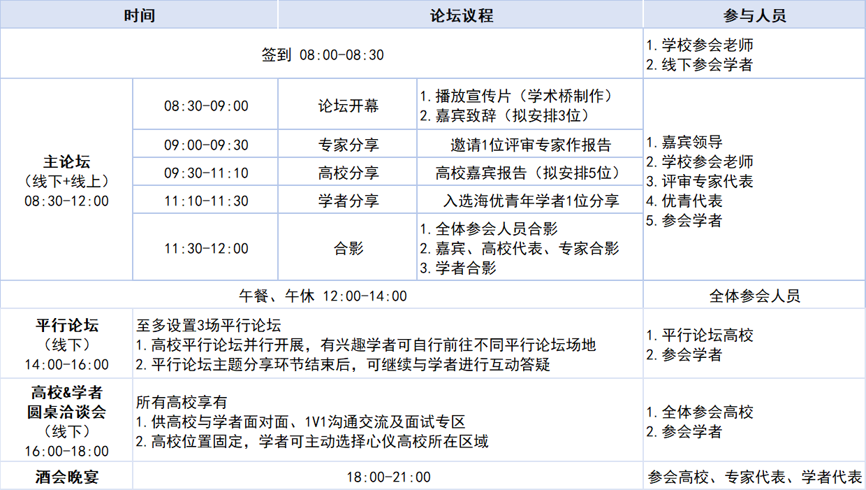 活動(dòng)為期1天,共設(shè)置4個(gè)環(huán)節(jié),包括:主論壇、高校平行論壇、高校&學(xué)者圓桌洽談會(huì)、酒會(huì)晚宴。