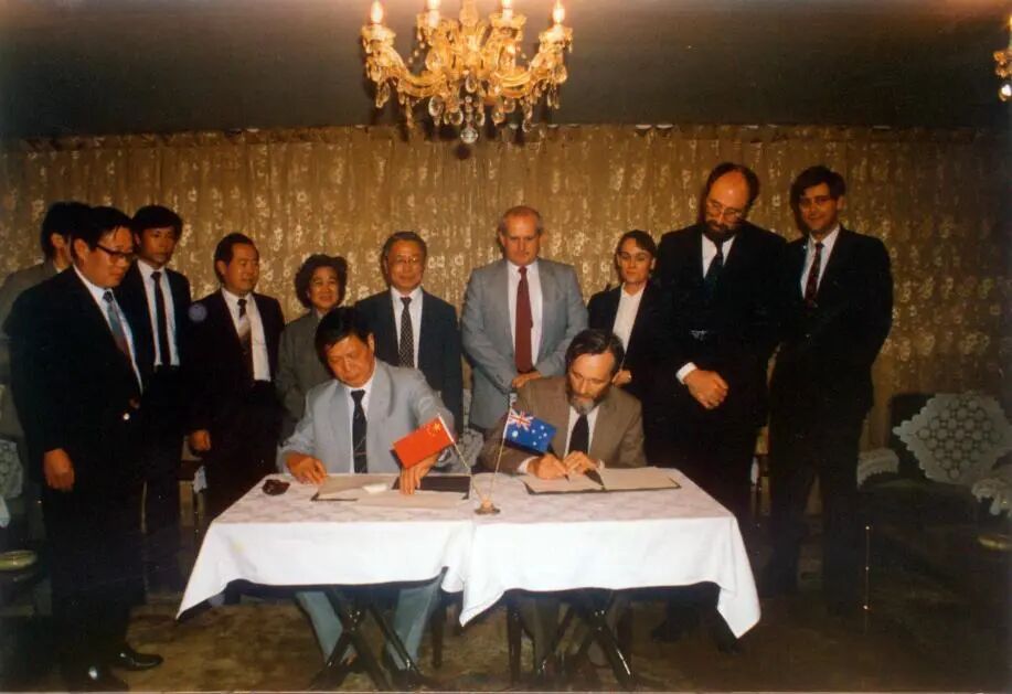 ▲ 1984年,張勇先(后排左三)在中澳教育交流協(xié)議簽署現(xiàn)場。