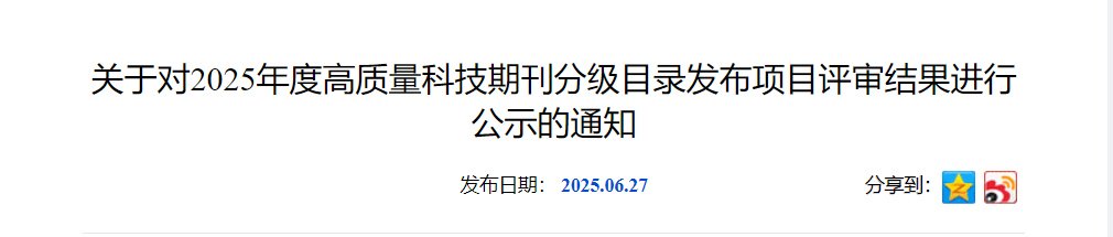 現(xiàn)將評審結果面向社會公示。公示期自2025年6月27日至7月1日,如有異議,請在公示期內以書面形式實名反饋至中國科協(xié)科學技術創(chuàng)新部科技期刊處(聯(lián)系電話:010-68571884)。