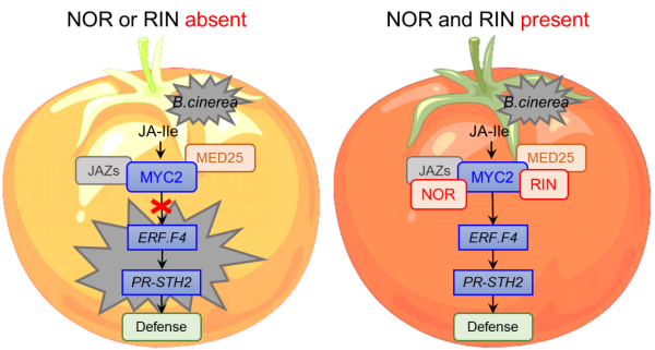 灰霉菌是死體營(yíng)養(yǎng)型病原真菌,而茉莉酸是植物抵御此類病原菌侵害的核心防御激素。病原菌入侵誘導(dǎo)活性茉莉酸信號(hào)分子即茉莉酸-異亮氨酸積累,進(jìn)而通過核心轉(zhuǎn)錄因子MYC2啟動(dòng)并級(jí)聯(lián)放大茉莉酸防御信號(hào)轉(zhuǎn)導(dǎo)。番茄果實(shí)成熟核心轉(zhuǎn)錄因子RIN和NOR是啟動(dòng)和調(diào)控成熟進(jìn)程的關(guān)鍵激活因子。