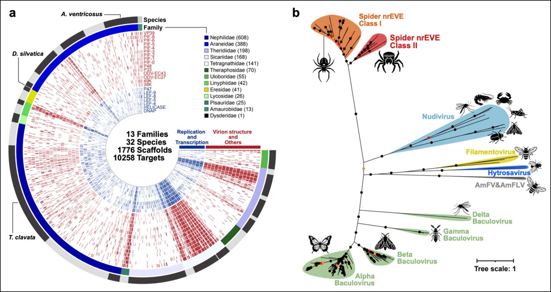 節(jié)肢動物是地球種類最豐富的動物類群,包括昆蟲、甲殼類動物、鱟、蝎子、蜘蛛等。NALDVs是一類以桿狀病毒為代表的主要感染節(jié)肢動物的大DNA病毒。已有研究表明,NALDVs可在宿主基因組中發(fā)生廣泛整合并形成非逆轉(zhuǎn)錄內(nèi)源性病毒元件。目前,科研人員尚未在蜘蛛中發(fā)現(xiàn)相關(guān)病毒或非逆轉(zhuǎn)錄內(nèi)源性病毒元件。