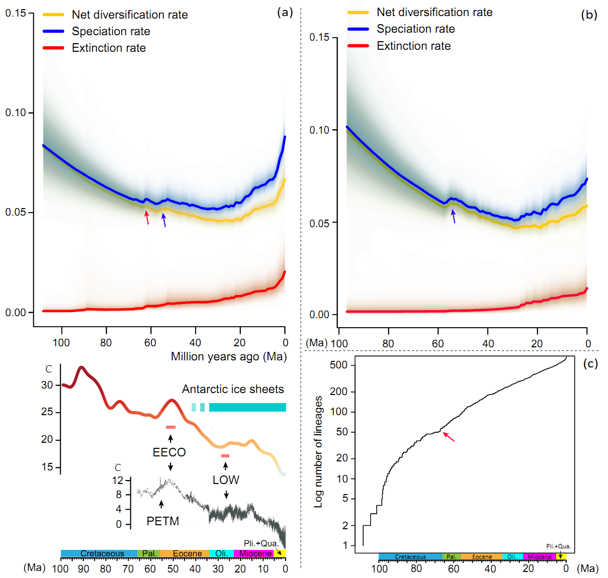 目前,全球氣候變化事件在很大程度上影響眾多生物群系演化歷史已是學(xué)界共識,但關(guān)于“古氣候變化事件是否影響熱帶雨林動(dòng)態(tài)演化歷史過程”這一問題尚存爭議。部分研究認(rèn)為,古氣候變化事件對熱帶雨林動(dòng)態(tài)演化歷史影響有限,熱帶雨林可能長期保持相對穩(wěn)定的高溫、高濕環(huán)境條件,并使其物種分化速率長期趨于恒定狀態(tài),因此其物種多樣性隨時(shí)間持續(xù)且穩(wěn)定的積累,這一過程被視為熱帶雨林物種多樣化的重要演化模式。也有研究認(rèn)為,熱帶雨林物種多樣化歷程可能受到全球氣候變化事件的影響,其物種分化速率在不同時(shí)期可能存在明顯波動(dòng)而非長期趨于恒定,但相關(guān)研究大多關(guān)注熱帶雨林類群在新生代時(shí)期的演化歷史。