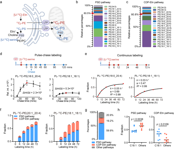 細(xì)胞內(nèi)常見(jiàn)脂質(zhì)分子在內(nèi)質(zhì)網(wǎng)從頭合成后,轉(zhuǎn)運(yùn)至線粒體和溶酶體等其他細(xì)胞器。為此,研究團(tuán)隊(duì)將亞細(xì)胞鄰近標(biāo)記脂質(zhì)組學(xué)技術(shù)與穩(wěn)定同位素示蹤標(biāo)記技術(shù)結(jié)合,發(fā)展出“鄰近標(biāo)記+13C-同位素”雙標(biāo)記策略,定量表征了脂質(zhì)分子從內(nèi)質(zhì)網(wǎng)到線粒體、溶酶體、細(xì)胞核等亞細(xì)胞器的轉(zhuǎn)運(yùn)規(guī)律,并定量分析了各種脂質(zhì)合成途徑和運(yùn)輸途徑對(duì)特定細(xì)胞器脂質(zhì)組成的貢獻(xiàn)比例。具體而言,脈沖-追蹤實(shí)驗(yàn)表明,磷脂酰絲氨酸由內(nèi)質(zhì)網(wǎng)向線粒體的轉(zhuǎn)運(yùn)在1小時(shí)內(nèi)快速進(jìn)行,且存在脂肪?;溒眯?。連續(xù)標(biāo)記實(shí)驗(yàn)通過(guò)檢測(cè)多個(gè)時(shí)間點(diǎn)線粒體、細(xì)胞核、溶酶體中雙標(biāo)記磷脂酰乙醇胺脂質(zhì)并利用一階速率方程,定量分析了內(nèi)質(zhì)網(wǎng)內(nèi)CDP-ethanolamine合成途徑(CDP-Etn)與線粒體內(nèi)磷脂酰絲氨酸脫羧酶合成途徑(PSD)對(duì)多種細(xì)胞器內(nèi)磷脂酰乙醇胺脂質(zhì)的貢獻(xiàn)。結(jié)果表明,線粒體中磷脂酰乙醇胺類脂質(zhì)主要來(lái)源于PSD合成途徑,而細(xì)胞核與溶酶體中磷脂酰乙醇胺脂質(zhì)主要來(lái)源于CDP-Etn合成途徑。線粒體中CDP-Etn合成途徑偏向貢獻(xiàn)含C18:1脂肪?;湹牧字R掖及奉愔|(zhì),PSD合成途徑則相反。進(jìn)一步,該方法揭示脂質(zhì)轉(zhuǎn)運(yùn)蛋白VPS13A和PDZD8在維持內(nèi)質(zhì)網(wǎng)與線粒體間脂質(zhì)轉(zhuǎn)運(yùn)中發(fā)揮關(guān)鍵作用,且具有脂肪酰基鏈選擇性。同時(shí),該方法還發(fā)現(xiàn),mTOR激活可特異性提高溶酶體中膽固醇、磷脂酰乙醇胺類脂質(zhì)和磷脂酰絲氨酸類脂質(zhì)的含量,而不影響整個(gè)細(xì)胞內(nèi)脂質(zhì)含量,為細(xì)胞器介導(dǎo)的脂質(zhì)代謝研究提供了技術(shù)支撐。