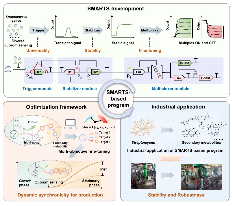 研究人員開發(fā)了一套普適性重編程工程策略,即基于對鏈霉菌群體感應控制系統(tǒng)多樣性及其信號傳導過程的認識,開發(fā)了普遍適用于該物種的正交、多路人工動態(tài)控制系統(tǒng)SMARTS。隨后,研究人員利用鏈霉菌次級代謝共性特征,提出了一套多靶點適配原則與標準化工作流程。進一步,研究人員利用該適配原則,開發(fā)出新型抗線蟲藥物柏維菌素的阿維鏈霉菌高產(chǎn)菌種,并在120m3工業(yè)發(fā)酵規(guī)模下實現(xiàn)了高效生產(chǎn)。