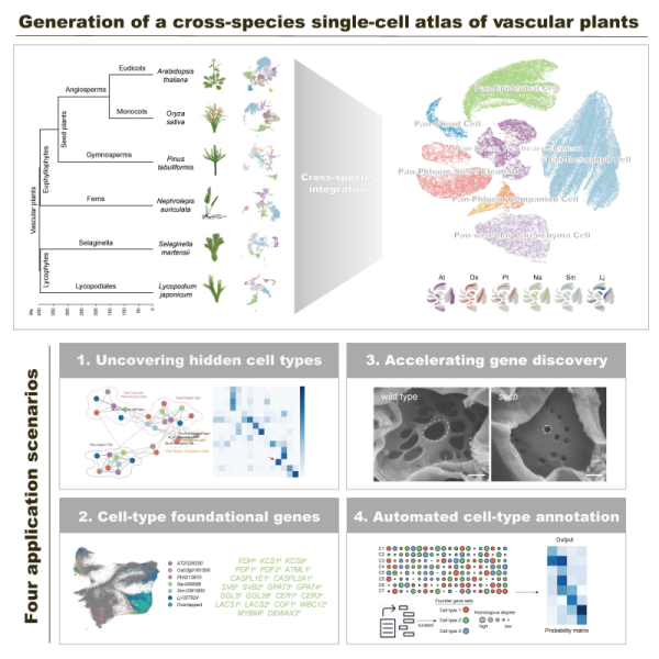 近日,中國科學(xué)院分子植物科學(xué)卓越創(chuàng)新中心、植物高效碳匯重點(diǎn)實(shí)驗(yàn)室王佳偉研究組突破了植物單細(xì)胞轉(zhuǎn)錄組測序底層技術(shù)難點(diǎn),繪制出世界首張維管植物整合細(xì)胞圖譜。研究通過系統(tǒng)鑒定維管植物各類細(xì)胞的底層基因,突破了基因高效挖掘的瓶頸,為植物發(fā)育生物學(xué)研究提供了全新的研究范式。