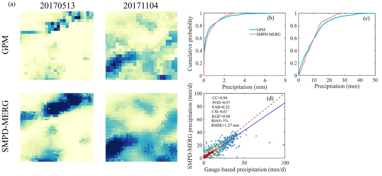 (a)旱季和雨季SMPD-MERG結果與原始GPM產品的空間分布對比;(b-c)旱季和雨季SMPD-MERG結果與原始GPM產品的累積概率比較;(d)SMPD-MERG結果與2016年至2018年雨量計觀測日降水的密度圖