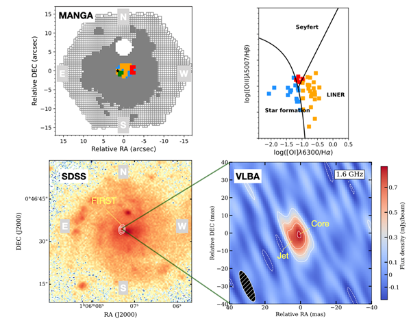 左上圖為光學(xué)積分視場單元光譜圖,右上圖為對應(yīng)像素的BPT診斷圖,利用星系光譜里幾條特定發(fā)射線的比例,來區(qū)分星系的電離源來自恒星形成和活動(dòng)星系核的貢獻(xiàn)。左下圖為光學(xué)觀測圖與射電FIRST巡天觀測等值線。右下圖射電射電甚長基線干涉陣列VLBA觀測到的核-噴流結(jié)構(gòu)。