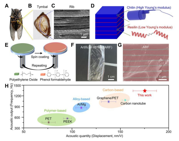 科研團隊解析蟬發(fā)聲器官——蟬肋骨膜的結(jié)構(gòu)與性能關系,并據(jù)此仿生制備出可用于聲學換能器的高性能仿生薄膜。團隊發(fā)現(xiàn),蟬肋骨膜中軟彈性蛋白層與硬幾丁質(zhì)層交替排列的結(jié)構(gòu),是其優(yōu)異力學性能的關鍵,即硬質(zhì)層承擔機械負荷,軟質(zhì)層通過大變形能力延緩裂紋擴展?;谶@一機理,團隊采用層層交替旋涂限域構(gòu)筑與界面交聯(lián)策略,制備出具有仿生軟硬交替結(jié)構(gòu)的全有機復合薄膜。在限域條件下,聚合物分子鏈之間的纏結(jié)作用增強,使該仿生薄膜同時具備高拉伸強度、韌性和耐疲勞性能。這些特性使其能夠兼顧高效聲能輸出與長期穩(wěn)定的聲傳播性能,其基本共振頻率和振幅均優(yōu)于現(xiàn)有商業(yè)化薄膜。