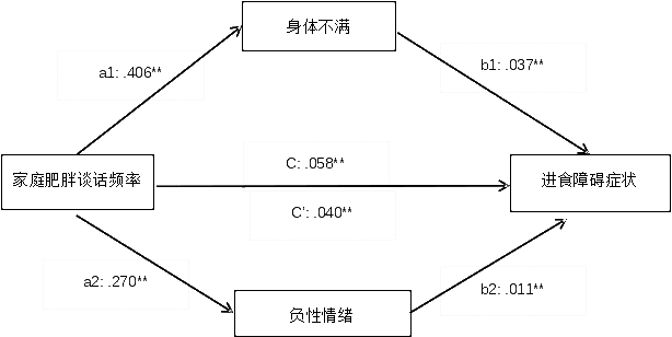 研究發(fā)現(xiàn),有67.1%的家庭存在“肥胖談話”現(xiàn)象,這類談話與青少年進(jìn)食障礙風(fēng)險存在中高度相關(guān)(男生:r=0.56;女生:r=0.63),且與他們的身體不滿意度及負(fù)性情緒呈中高度相關(guān)。同時,研究顯示,家庭“肥胖談話”直接與青少年進(jìn)食障礙癥狀之間存在關(guān)聯(lián),還可能通過體像不滿和負(fù)性情緒,間接地與進(jìn)食障礙癥狀關(guān)聯(lián)在一起。尤其在女生中,家庭“肥胖談話”經(jīng)由體像不滿和進(jìn)食障礙癥狀之間的關(guān)聯(lián)更需關(guān)注。
