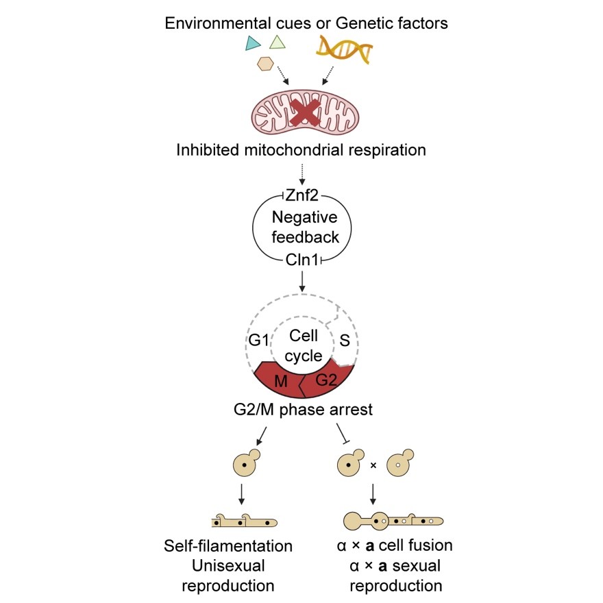 研究團(tuán)隊(duì)通過大規(guī)模T-DNA插入突變篩選,發(fā)現(xiàn)了一系列同性生殖能力增強(qiáng),且雙性生殖能力明顯減弱的突變體,這暗示兩種有性生殖模式之間存在相互抑制的關(guān)系?;蚪M測(cè)序結(jié)果顯示,這些突變體的T-DNA插入位點(diǎn)富集于呼吸作用相關(guān)基因中。后續(xù)功能實(shí)驗(yàn)表明,抑制呼吸作用可上調(diào)關(guān)鍵轉(zhuǎn)錄因子Znf2的表達(dá),進(jìn)而直接抑制B型細(xì)胞周期蛋白Cln1,最終導(dǎo)致細(xì)胞周期停滯于G2/M期。這種細(xì)胞周期停滯狀態(tài)一方面促進(jìn)了同性生殖發(fā)育,另一方面抑制了雙性生殖過程中的細(xì)胞融合過程。