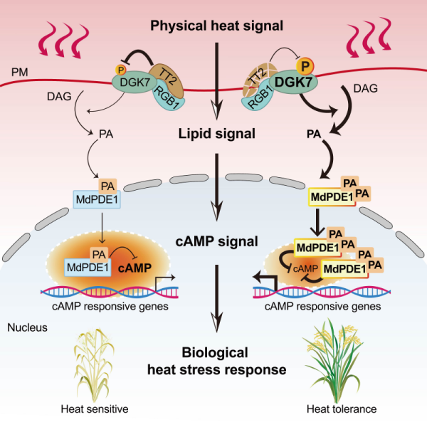 為解析PA信號的后續(xù)傳遞機制,團隊通過功能域篩選,鑒定到具有PA結(jié)合域和磷酸二酯酶催化域的雙功能蛋白MdPDE1。該蛋白能夠感知PA濃度變化,與PA結(jié)合并被激活,轉(zhuǎn)移到細(xì)胞核中,通過水解環(huán)磷酸腺苷(cAMP)降低核內(nèi)cAMP水平,完成脂質(zhì)信號向cAMP信號第二步轉(zhuǎn)換。點突變實驗證實,MdPDE1的PA結(jié)合能力是其核定位與功能執(zhí)行的關(guān)鍵。最終,核內(nèi)cAMP水平下降觸發(fā)轉(zhuǎn)錄重編程,上調(diào)小熱激蛋白和活性氧清除酶等相關(guān)基因的表達(dá),從而在細(xì)胞層面建立起一套完整的耐熱響應(yīng)機制,能夠顯著增強水稻的高溫耐受能力。G蛋白—DGK7—PA—MdPDE1—cAMP信號途徑的完整解析,闡明了植物從細(xì)胞膜感知到核內(nèi)基因表達(dá)調(diào)控的熱信號全程解碼機制,為剖析植物逆境響應(yīng)機制提供了新的分子框架。