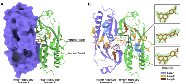 研究發(fā)現(xiàn),豌豆根瘤菌NodD蛋白的配體結(jié)合結(jié)構(gòu)域,通過兩個蛋白口袋識別橙皮素——一個位于NodD蛋白的單體中,另一個位于NodD蛋白的二聚界面上,這種結(jié)合構(gòu)象在NodD所屬的轉(zhuǎn)錄調(diào)控因子家族中屬首次發(fā)現(xiàn)。