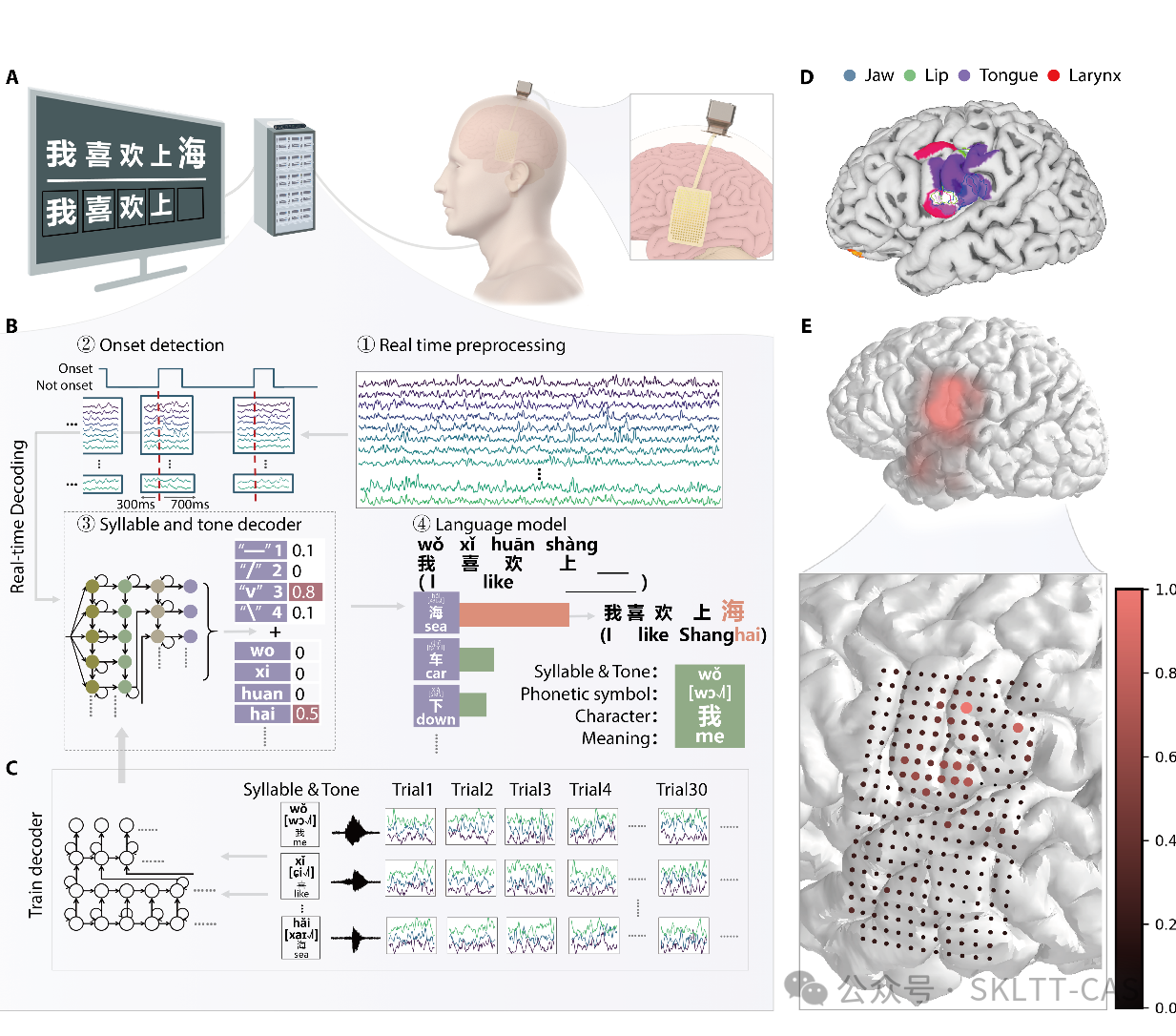 研究團(tuán)隊(duì)通過構(gòu)建多級實(shí)時(shí)解碼數(shù)據(jù)流,以50毫秒滑動(dòng)窗口提取70Hz至170Hz的High-γ頻段腦電信號,并對齊腦電信號與發(fā)音起始點(diǎn),驅(qū)動(dòng)雙流解碼器同步生成音節(jié)與聲調(diào)的概率分布,進(jìn)而融合語言模型進(jìn)行最合適的句子組合選擇,實(shí)現(xiàn)實(shí)時(shí)漢語語句輸出。研究顯示,受試者經(jīng)過9天的語言解碼任務(wù)后,394個(gè)漢語音節(jié)(解碼未覆蓋音節(jié)為生僻音節(jié)且受試者不認(rèn)識)純神經(jīng)解碼平均準(zhǔn)確率達(dá)到71.2%,單音節(jié)解碼延時(shí)65ms,實(shí)時(shí)漢語語句解碼速率達(dá)到49.6字/分鐘。