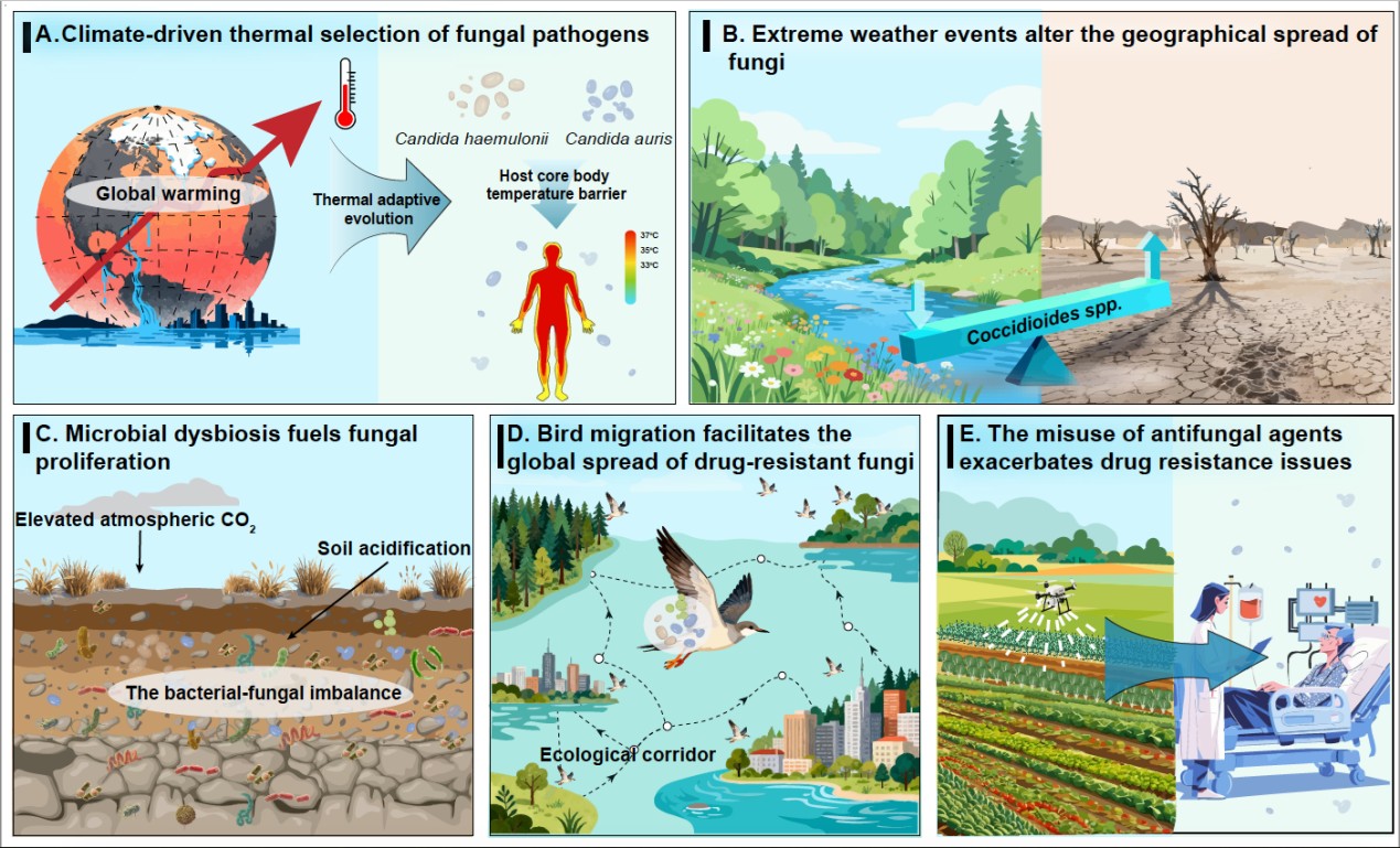 真菌病原體涌現(xiàn)的環(huán)境與人為驅(qū)動因素示意圖