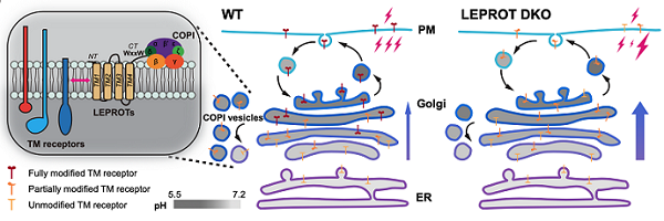 COPI介導(dǎo)的膜轉(zhuǎn)運(yùn),在細(xì)胞中主要負(fù)責(zé)內(nèi)質(zhì)網(wǎng)蛋白回收和高爾基體蛋白滯留。研究發(fā)現(xiàn),LEPROTs主要定位于順式與中間高爾基體區(qū)域,其缺失會導(dǎo)致高爾基體形態(tài)異常。同時,LEPROTs可與COPI衣被蛋白及多類跨膜區(qū)較長的整合膜蛋白結(jié)合,在酸性環(huán)境下將跨膜受體捕捉,并由COPI系統(tǒng)將其短暫“滯留”于高爾基體,使其獲得充分的糖基化、脂?;汝P(guān)鍵修飾。在LEPROTs缺失的細(xì)胞里,跨膜受體被提前釋放至下游通路,使EGFR、TFRC等多種信號受體發(fā)生加工缺陷和活性異常。