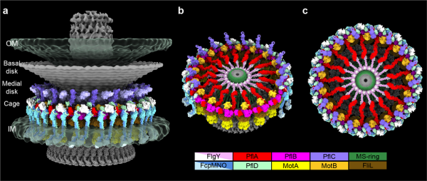 鞭毛是驅(qū)動細(xì)菌細(xì)胞運(yùn)動的重要納米機(jī)器,在海洋等多種環(huán)境中協(xié)助細(xì)菌實(shí)現(xiàn)空間遷移與環(huán)境響應(yīng)。不同細(xì)菌的鞭毛結(jié)構(gòu)差異明顯,以往研究主要集中于結(jié)構(gòu)簡單的模式菌株大腸桿菌和沙門氏菌的馬達(dá)。然而,自然界中大多數(shù)細(xì)菌存在更為復(fù)雜的鞭毛馬達(dá),其額外結(jié)構(gòu)的組成、組裝時序以及進(jìn)化路徑缺乏系統(tǒng)研究,限制了學(xué)界對細(xì)菌馬達(dá)多樣性和運(yùn)動機(jī)制的理解??漳c彎曲菌具有高度復(fù)雜的鞭毛馬達(dá)結(jié)構(gòu),為研究該問題提供了理想模型。