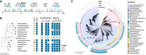 進(jìn)化分析顯示,籠狀結(jié)構(gòu)是彎曲菌門的特有結(jié)構(gòu),而E環(huán)和輻條結(jié)構(gòu)廣泛存在于多種具有鞭毛的物種中,這暗示其或起源于細(xì)菌共同祖先,演化歷史久遠(yuǎn)。研究進(jìn)一步揭示,彎曲菌門自深海熱液口祖先開始,其鞭毛馬達(dá)“借用”了IV型菌毛系統(tǒng)的部分結(jié)構(gòu)單元,形成了包裹定子復(fù)合體的輻條與籠狀結(jié)構(gòu),是細(xì)菌大分子機(jī)器演化過程中一次典型的“拓展適應(yīng)”事件。