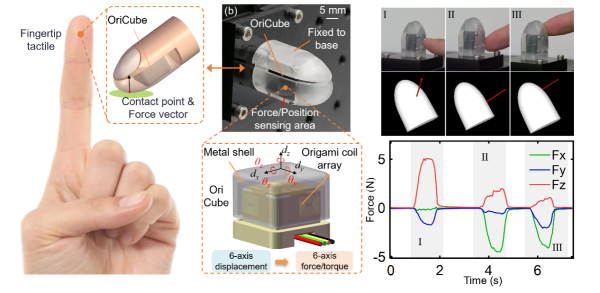 近日,中國科學(xué)技術(shù)大學(xué)團(tuán)隊(duì)研制出指尖大小六維力/力矩(F/T)傳感器——OriCube。該傳感器體積僅14×14×12mm3、重量4g,在23N量程下實(shí)現(xiàn)3mN級(jí)分辨率,并可嵌入機(jī)器人靈巧手指尖,在曲面接觸中實(shí)時(shí)輸出接觸點(diǎn)位置與力矢量,能夠?yàn)闄C(jī)器人“像人一樣用手指觸摸與操作”提供感知能力。