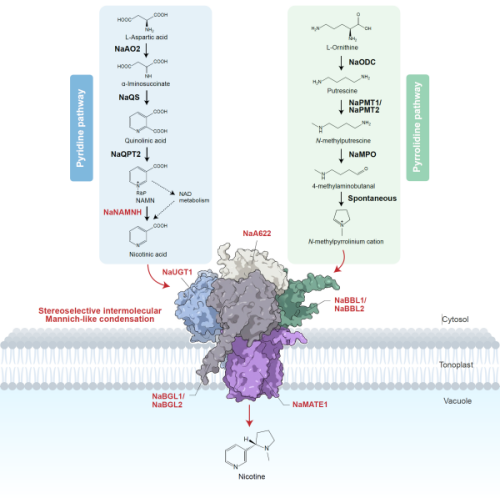 研究發(fā)現(xiàn),尼古丁最終合成由一個定位于液泡膜的五組分動態(tài)代謝通道協(xié)同實現(xiàn)。整個過程采用糖基化和去糖基化機制。煙酸通過糖基轉(zhuǎn)移酶進行氮原子的糖基化修飾,維持其陽離子狀態(tài);隨后由還原酶進行還原并脫羧,對分子進行活化;通過一個由類小檗堿橋酶連續(xù)催化具有立體選擇性的分子間曼尼希反應(yīng)完成與另一個吡咯烷環(huán)的分子間縮合以及后續(xù)氧化反應(yīng);最后經(jīng)葡萄糖苷水解酶進行去糖基化,生成手性純凈的尼古丁,并通過MATE轉(zhuǎn)運蛋白存儲于液泡中。這一代謝通道實現(xiàn)了中間產(chǎn)物高效傳遞,避免了有毒中間體積累,并防止了高濃度產(chǎn)物對合成途徑的反饋抑制,解決了植物自身防御中的“自毒困境”。