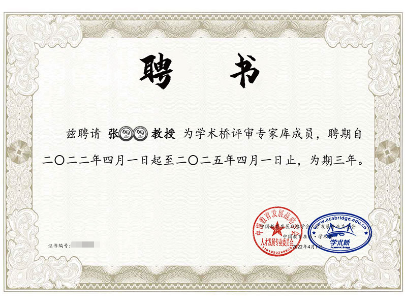 在此,誠摯邀請您加入“學術橋評審專家?guī)臁睋卧u審專家,如您同意加入,請您回復告知您基本信息,我們將為您提供電子版“評審專家證書”,聘書樣式如下圖: