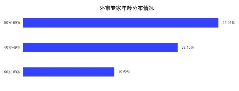 《報告》指出,外審專家覆蓋不同的學科背景、年齡段,群體構(gòu)成具有多樣性。《報告》統(tǒng)計,在年齡上,50~59歲的專家占比最高,達41.94%;40~49歲的專家占比其次,達33.15%;表明這兩個年齡段是外審專家集中的主力人群,同時也反映出大部分外審專家的資歷和評審經(jīng)驗相對豐富。此外,2678名外審專家來自97個一級學科、543個二級學科,在學科覆蓋方面具有較好的代表性??梢钥闯?,外審專家們覆蓋不同的學科背景、學術(shù)能力及評價經(jīng)驗,系統(tǒng)可以更精準地根據(jù)各委托單位的評審要求,智能匹配評審專家,確保人才評價的多樣性和包容性。