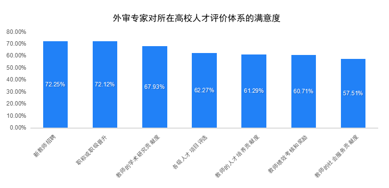 《報告》發(fā)現(xiàn),高校人才評價體系在多數(shù)維度上表現(xiàn)良好,但仍需針對特定領(lǐng)域進行優(yōu)化和改進。據(jù)統(tǒng)計,“新教師招聘”“職稱或職級晉升”“教師的學術(shù)研究貢獻度”滿意度(“滿意度”為“非常滿意”與“比較滿意”選項占比之和)排名前三,分別達到72.25%、72.12%和67.93%。外審專家對“教師的社會服務(wù)貢獻度”“教師績效考核和獎勵”以及“教師的人才培養(yǎng)貢獻度”滿意度相對較低,分別為57.51%、60.71%、61.29%,這提醒高校在人才評價體制機制改革上要考慮進一步細化和優(yōu)化評價標準。值得注意的是,不同層次高校的參評專家對所屬院校人才評價體系各方面滿意度分布趨勢相似,但“雙一流”高校專家滿意度高于均值,可見“雙一流”高校在人才評價體系建設(shè)方面走在我國高校前列。