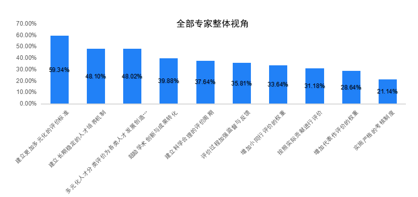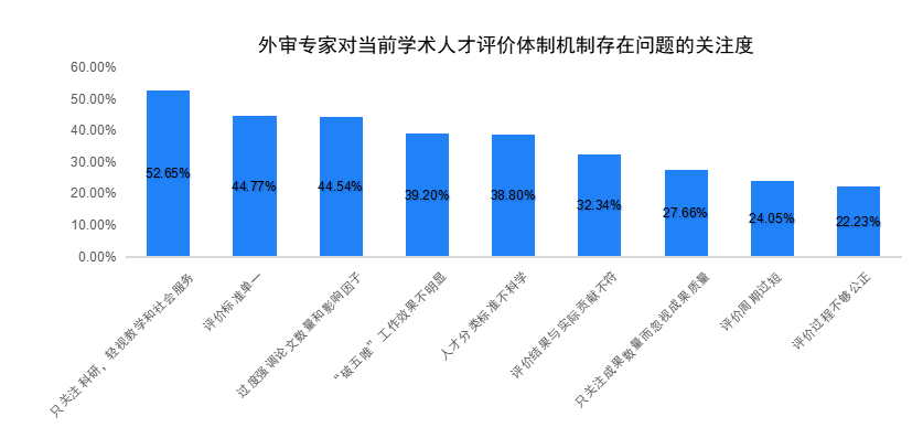 《報告》認為,高校應(yīng)建立更加多元化的人才評價標準以及長期穩(wěn)定的人才培養(yǎng)機制。對當前學術(shù)人才評價體制機制存在的問題,外審專家關(guān)注度最高的是“只注重科研,輕視教學和社會服務(wù)(52.65%)”,其次是“評價標準單一(44.77%)”和“過度強調(diào)論文數(shù)量和影響因子(44.54%)”。總體來看,在高校學術(shù)人才評價的改進建議中,外審專家們更建議“建立更加多元化的評價標準”“建立長期穩(wěn)定的人才培養(yǎng)機制”與“多元化人才分類評價為各類人才發(fā)展創(chuàng)造條件”。此外,還應(yīng)建立長期穩(wěn)定的人才培養(yǎng)機制,鼓勵學術(shù)創(chuàng)新與成果轉(zhuǎn)化,并加強評價過程的監(jiān)督與反饋。