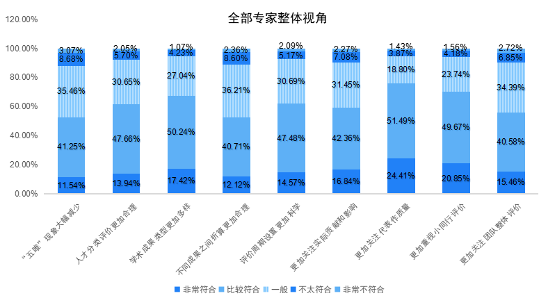 《報告》提醒,高校應(yīng)持續(xù)關(guān)注并推進人才評價體系改革,構(gòu)建一個更加公正、科學和多元化的人才評價體系。調(diào)研顯示,受訪者普遍對高校人才評價改革持積極態(tài)度,并對各項改革的認可度維持在“比較符合”的較高水準。按照“非常符合”與“比較符合”選項占比之和統(tǒng)計,其中“更加關(guān)注代表作質(zhì)量”(75.90%)“更加重視小同行評價(70.52%)”“學術(shù)成果類型更加多樣(67.66%)”,這三項改革都取得了高度的認可,反映出改革在推動同行評價機制的建立和完善上獲得了專家的認可。而“更加關(guān)注團隊整體評價(56.04%)”“不同成果之間折算更加合理(52.83%)”“‘五唯’現(xiàn)象大幅減少(52.79%)”這三個維度中,“一般”評價占比顯著高于其他方面,高校人才評價體制機制改革工作依然有待進一步落實。