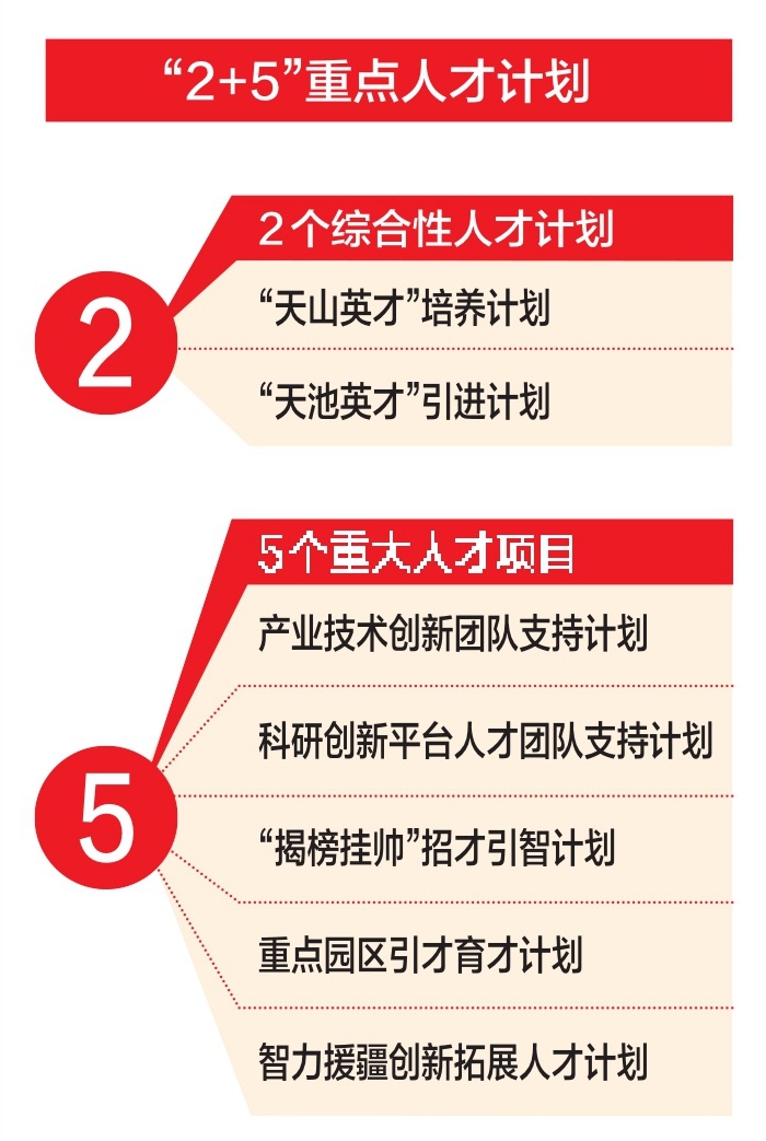 啟動實施具有整體拉動作用的“2+5”重點人才計劃。主要包括“天山英才”培養(yǎng)計劃、“天池英才”引進(jìn)計劃兩個綜合性人才計劃,以及產(chǎn)業(yè)技術(shù)創(chuàng)新團(tuán)隊支持計劃、科研創(chuàng)新平臺人才團(tuán)隊支持計劃、“揭榜掛帥”招才引智計劃、重點園區(qū)引才育才計劃、智力援疆創(chuàng)新拓展人才計劃等5個重大人才項目,為經(jīng)濟(jì)社會高質(zhì)量發(fā)展培養(yǎng)集聚人才。