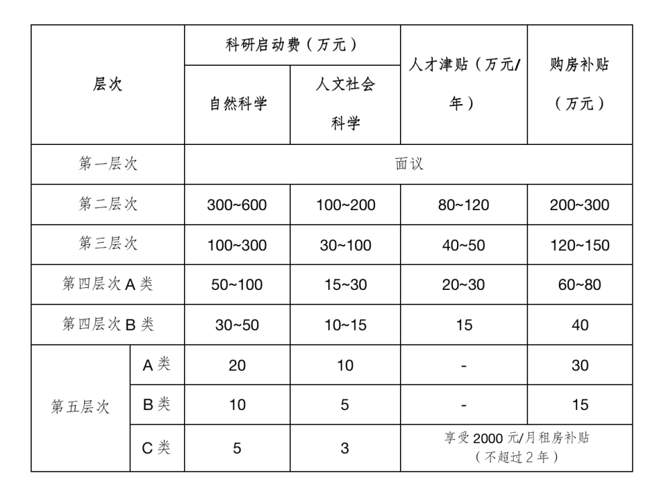 引進(jìn)人才全職到崗后,除享受?chē)?guó)家規(guī)定的相應(yīng)專(zhuān)業(yè)技術(shù)人員的工資、社會(huì)保險(xiǎn)等待遇外,學(xué)校提供如下待遇: