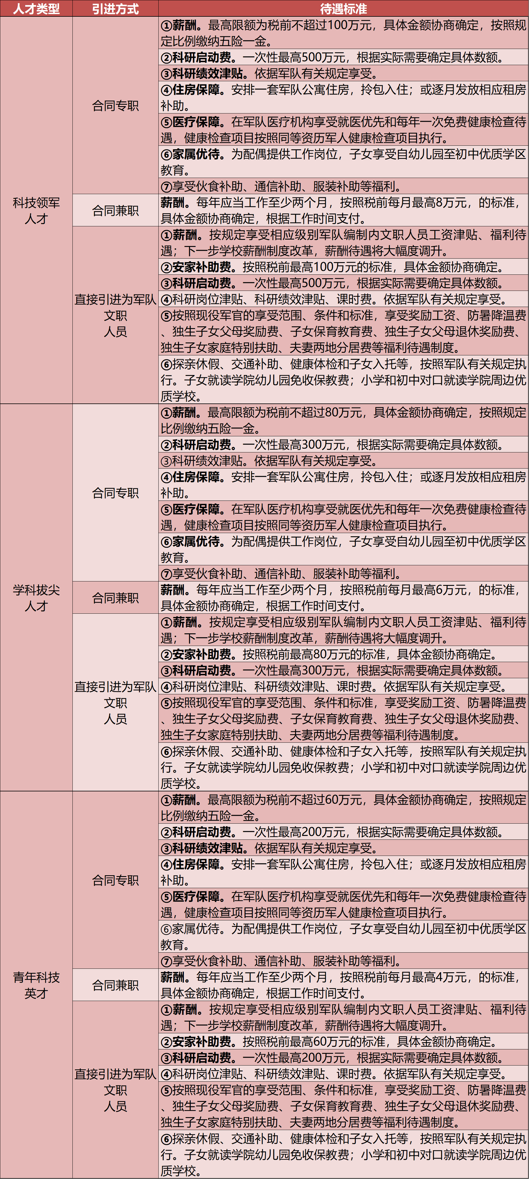 (一)合同專職。合同期限一般為一年以上、五年以下。①薪酬。最高限額為:科技領(lǐng)軍人才稅前不超過100萬元、學(xué)科拔尖人才稅前不超過80萬元、青年科技英才稅前不超過60萬元,具體金額協(xié)商確定,按照規(guī)定比例繳納五險一金。②科研啟動費。按照每名科技領(lǐng)軍人才一次性最高500萬元、每名學(xué)科拔尖人才最高300萬元、每名青年科技英才最高200萬元的標準,根據(jù)實際需要確定具體數(shù)額。③依據(jù)軍隊有關(guān)規(guī)定享受相應(yīng)的科研績效津貼。④住房保障。安排一套軍隊公寓住房,拎包入住;或逐月發(fā)放相應(yīng)租房補助。⑤醫(yī)療保障。在軍隊醫(yī)療機構(gòu)享受就醫(yī)優(yōu)先和每年一次免費健康檢查待遇,健康檢查項目按照同等資歷軍人健康檢查項目執(zhí)行。⑥家屬優(yōu)待。為配偶提供工作崗位,子女享受自幼兒園至初中優(yōu)質(zhì)學(xué)區(qū)教育。⑦享受伙食補助、通信補助、服裝補助等福利。